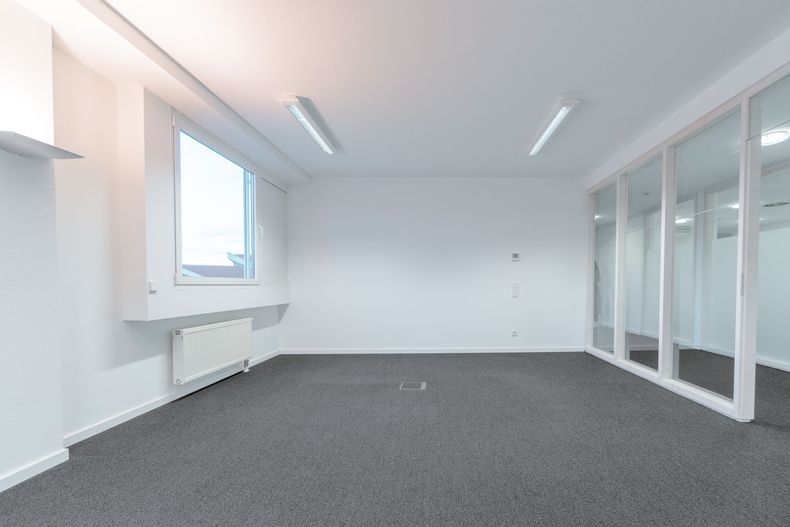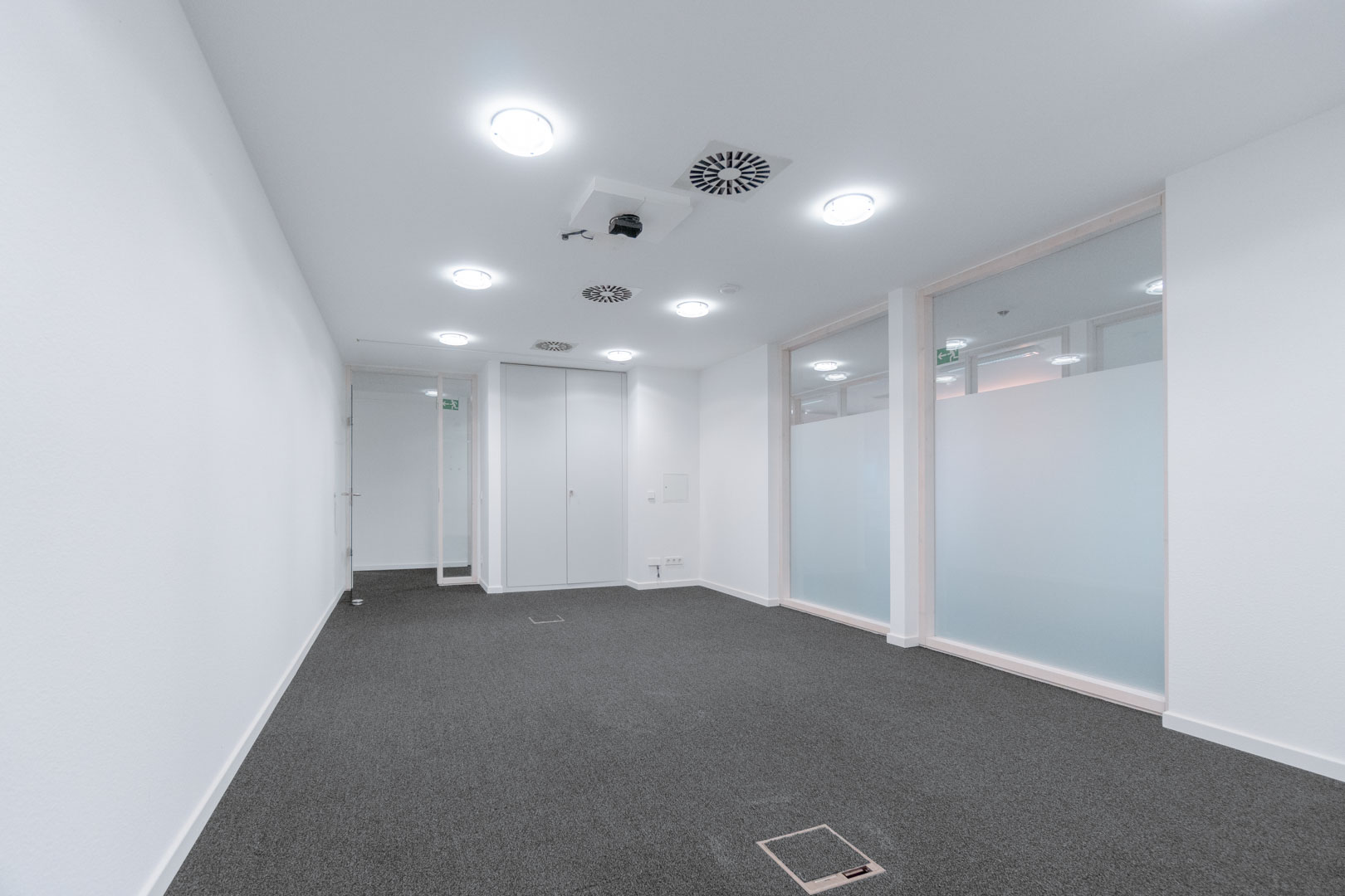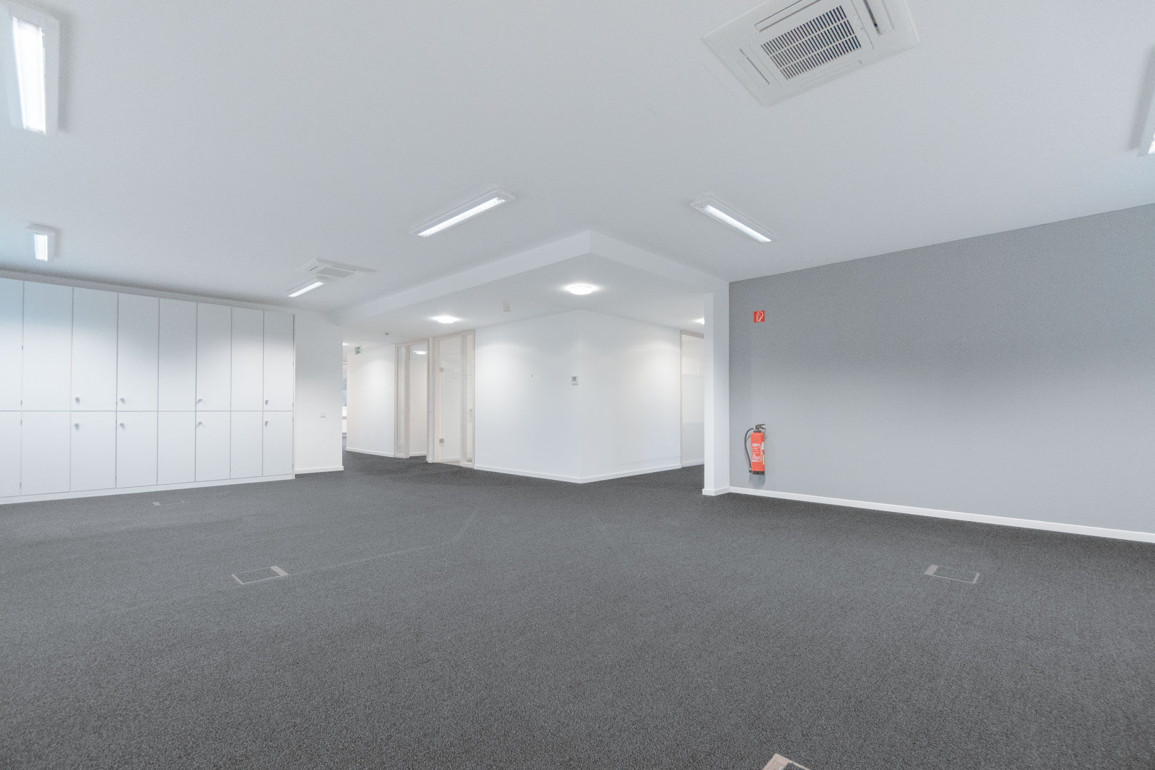 Der aktuell vorhandene Teppichboden ist mit einer Vielzahl an Bodentanks ausgestattet, was eine flexible Anordnung von Arbeitsplätzen ermöglicht. Leuchtmittel sind bereits installiert.