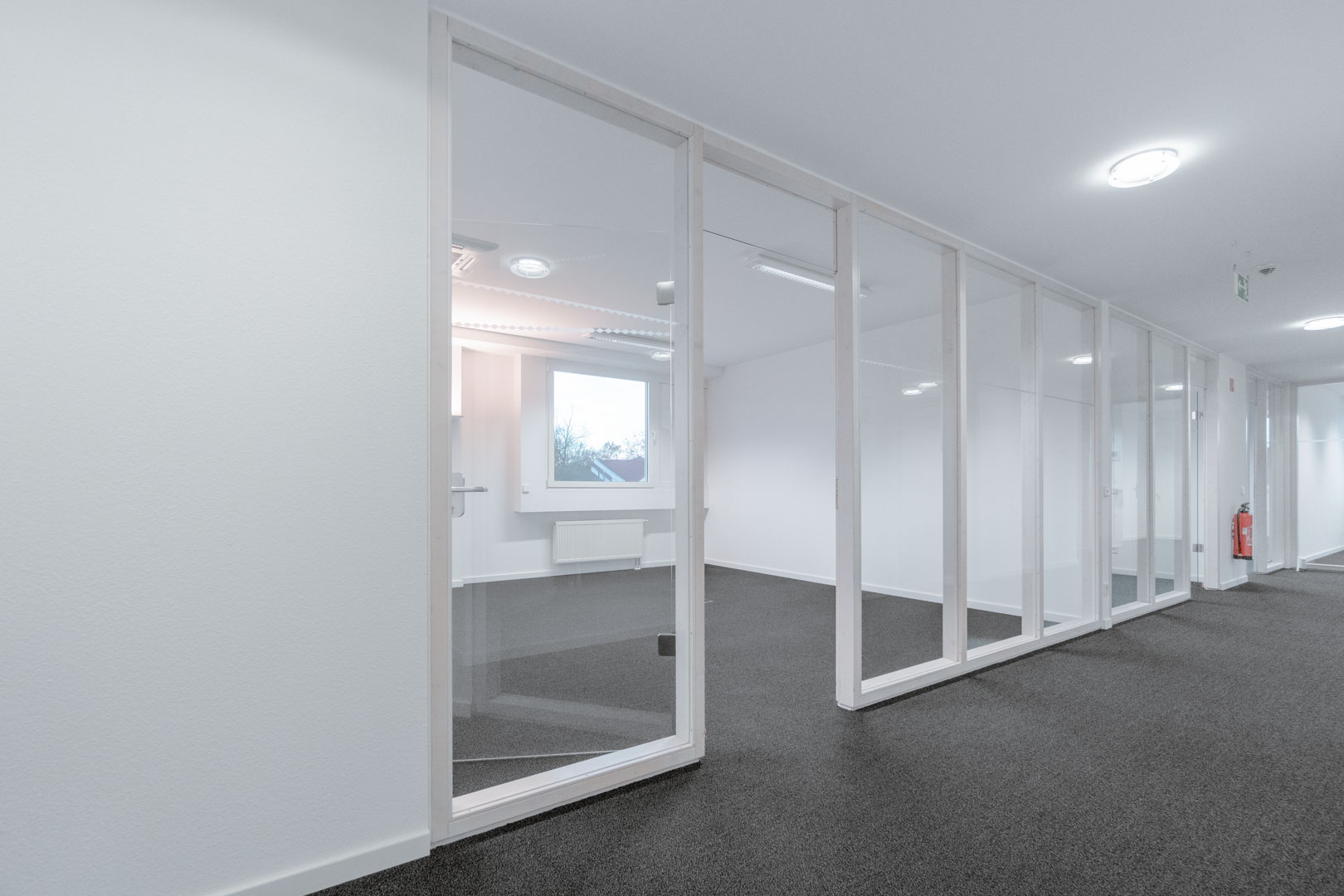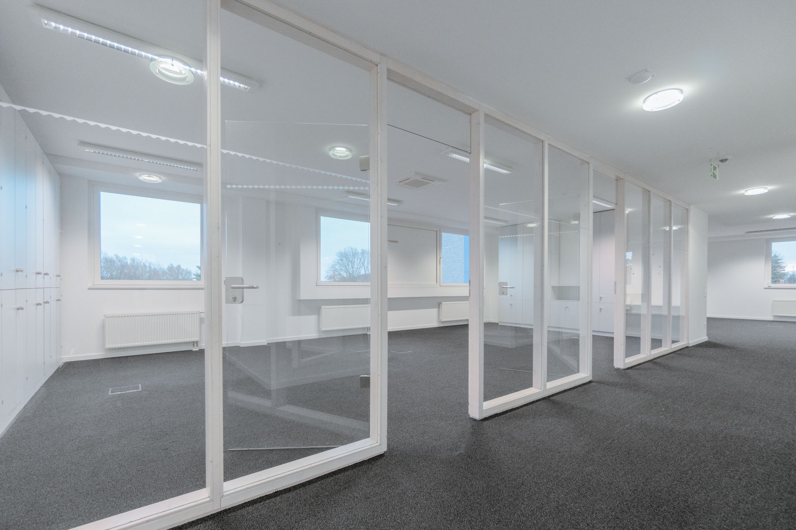 Die Kombination aus klassischen Wänden und gläsernen Trennelementen schafft einerseits Privatsphäre, ermöglicht andererseits aber auch Sichtkontakt und Transparenz innerhalb der Etage. Durch die zahlreichen Fenster gelangt viel Tageslicht in die Büros, wodurch die Fläche insgesamt sehr hell wirkt.