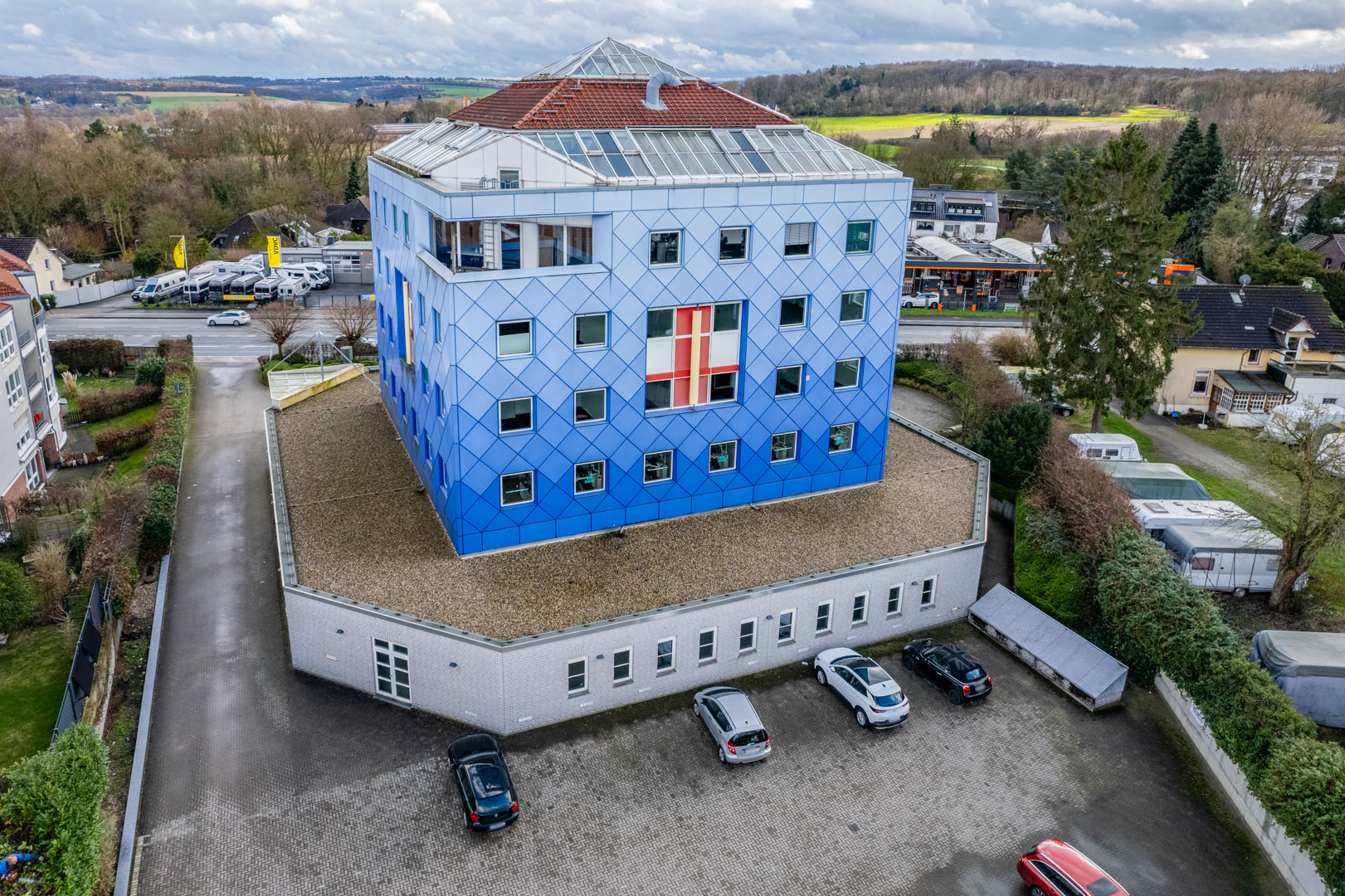 • 95 Stellplätze (56 Tiefgarage, 39 außen).