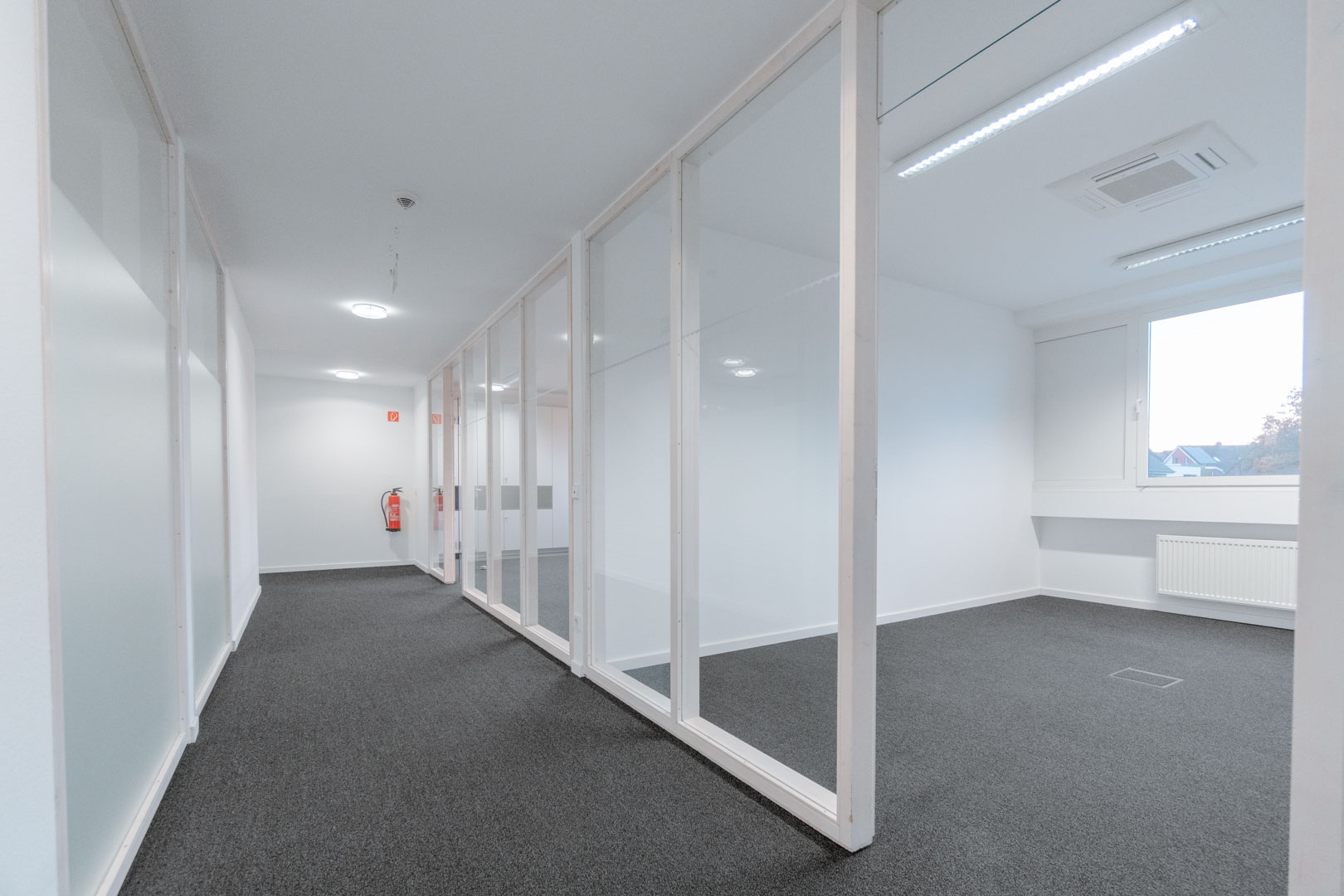 Auf der Etage stehen insgesamt neun abschließbare Büros unterschiedlicher Größe zur Verfügung, die sowohl als Einzelbüros als auch für mehrere Arbeitsplätze genutzt werden können. Ergänzt wird die Fläche durch einen Besprechungsraum, einen Archivraum sowie eine Küche. Die Räumlichkeiten sind klimatisiert.