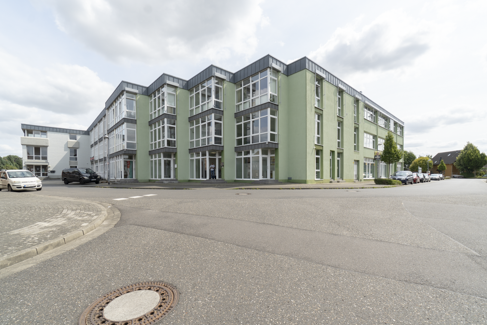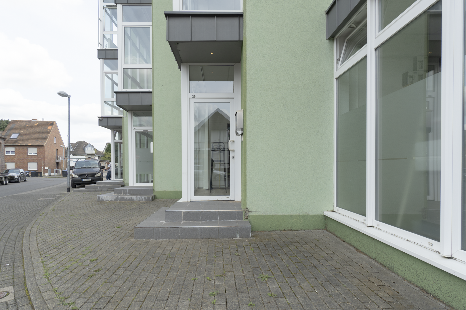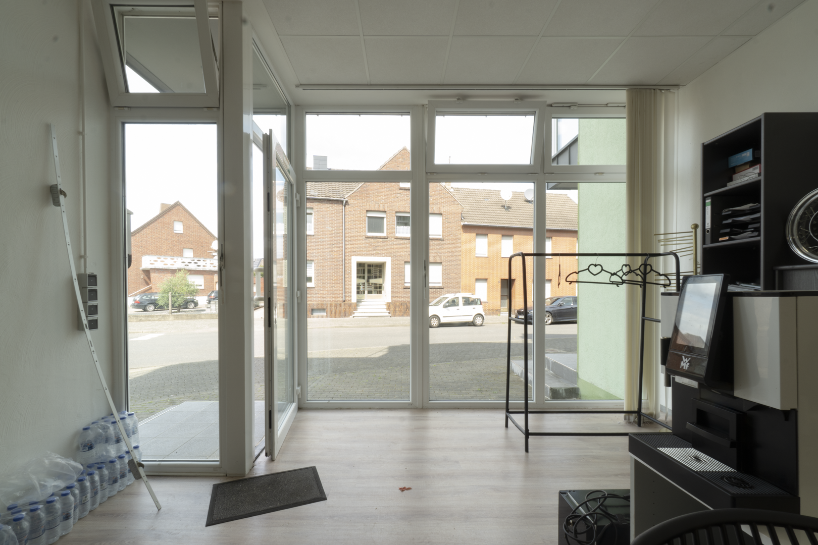 Diese attraktive Bürofläche im Erdgeschoss überzeugt mit einem eigenen Eingang direkt zur Straßenseite. Große, bodentiefe Fenster sorgen für viel Tageslicht und eine einladende Atmosphäre. Ein dezent gestaltetes Vordach über der Eingangstür bietet zudem praktischen Wetterschutz.