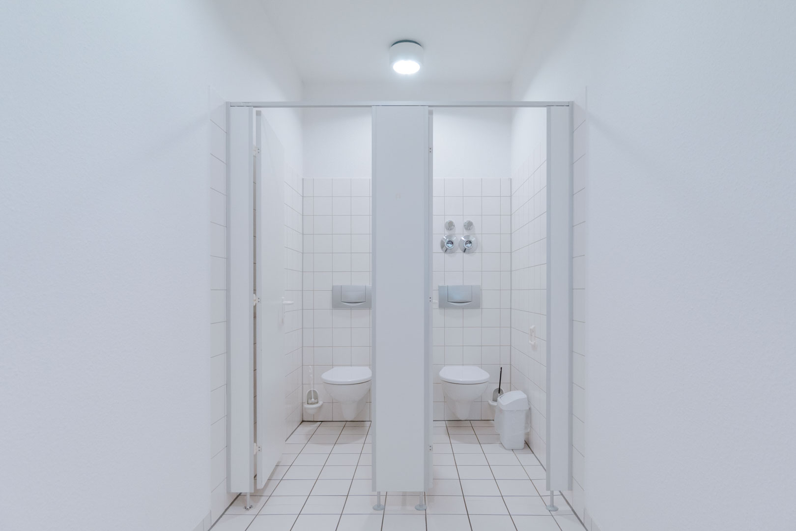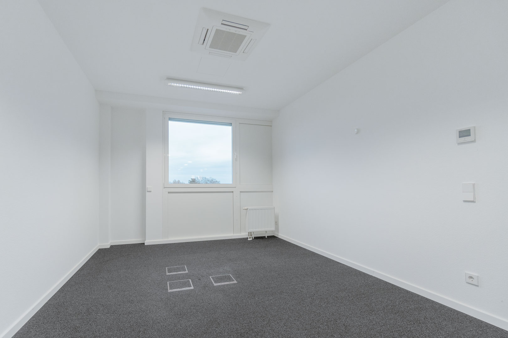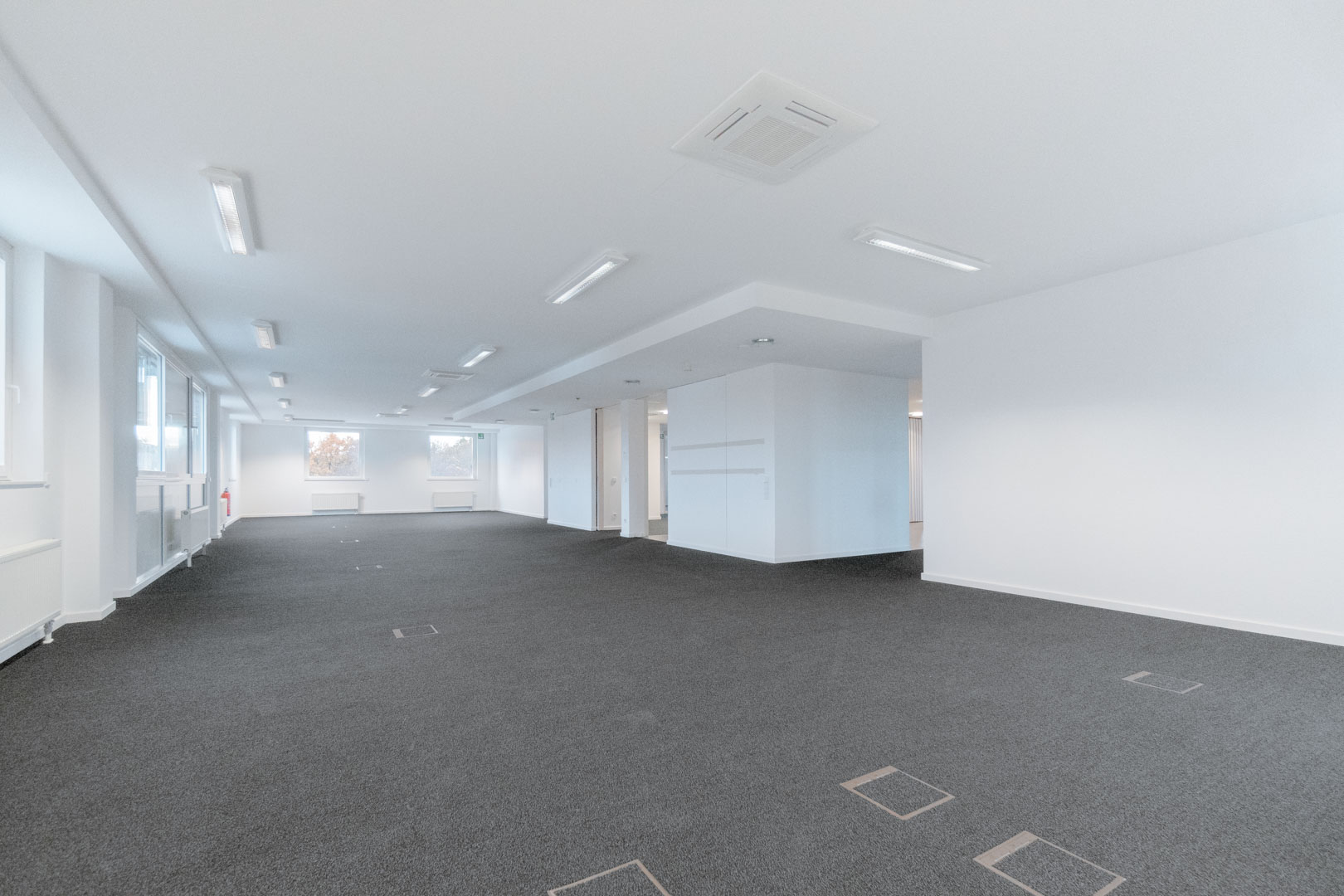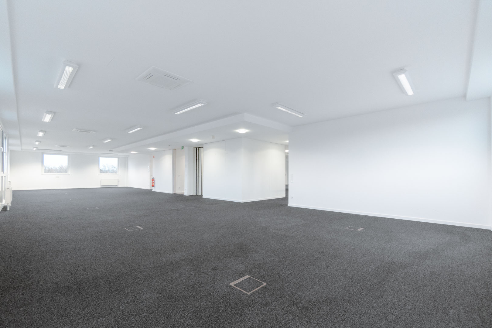 Die zahlreichen Bodentanks ermöglichen eine variable Positionierung von Arbeitsplätzen und Funktionsbereichen. Leuchtmittel sind installiert.