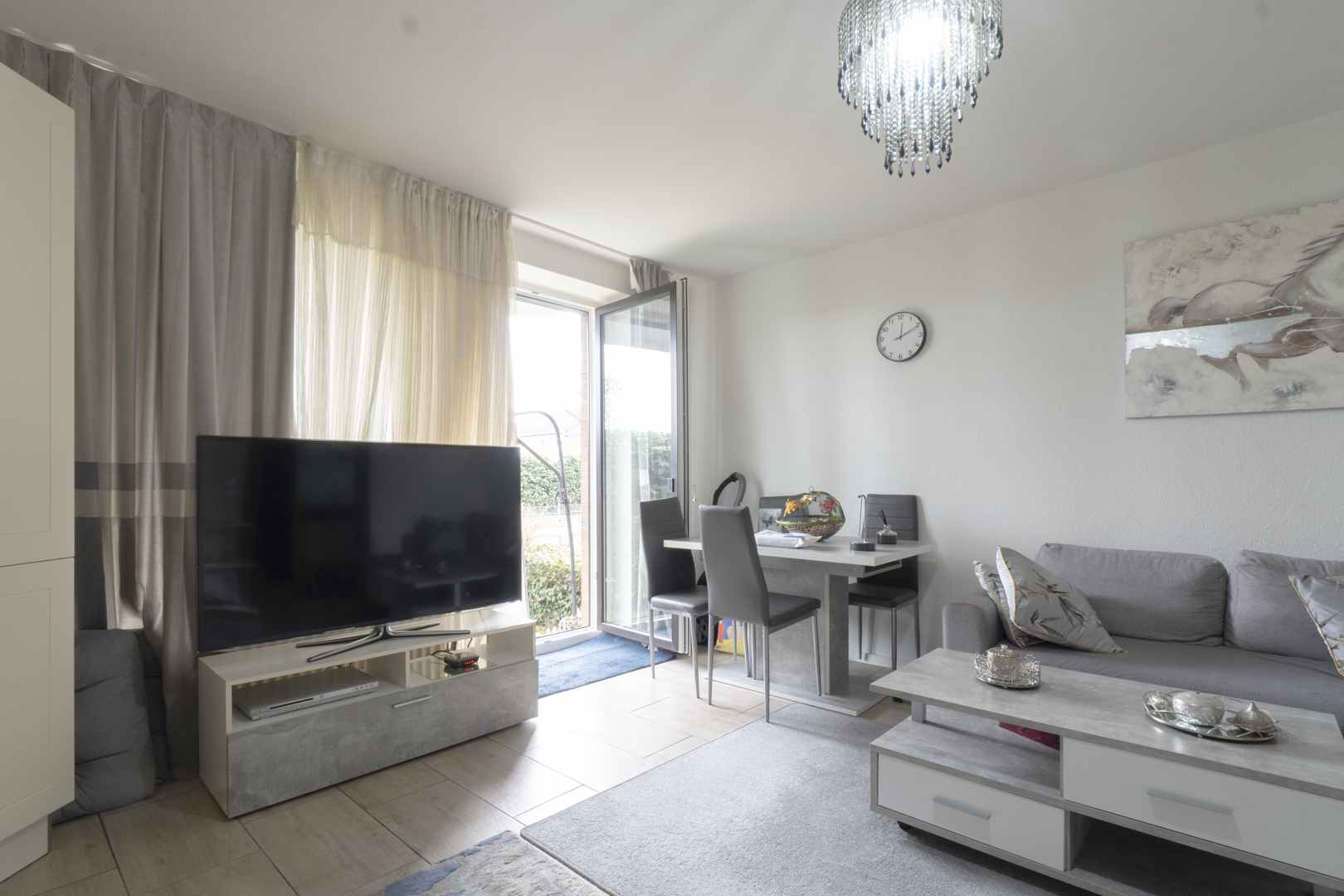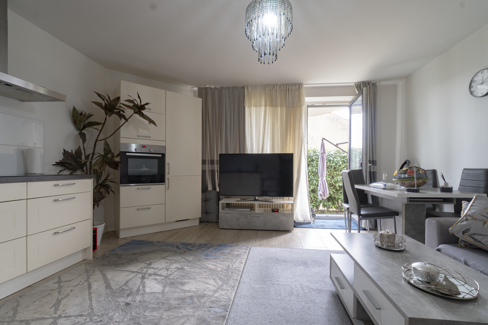 Den Mittelpunkt der Wohnung bildet das Wohn- und Esszimmer mit Zugang zum Gartenanteil. Der Außenbereich entspricht in seiner Größe einem großzügigen Balkon und ist durch Kirschlorbeer-Hecken blickgeschützt. Er bietet Platz für eine kleine Sitzgruppe und eine ruhige, geschützte Atmosphäre.