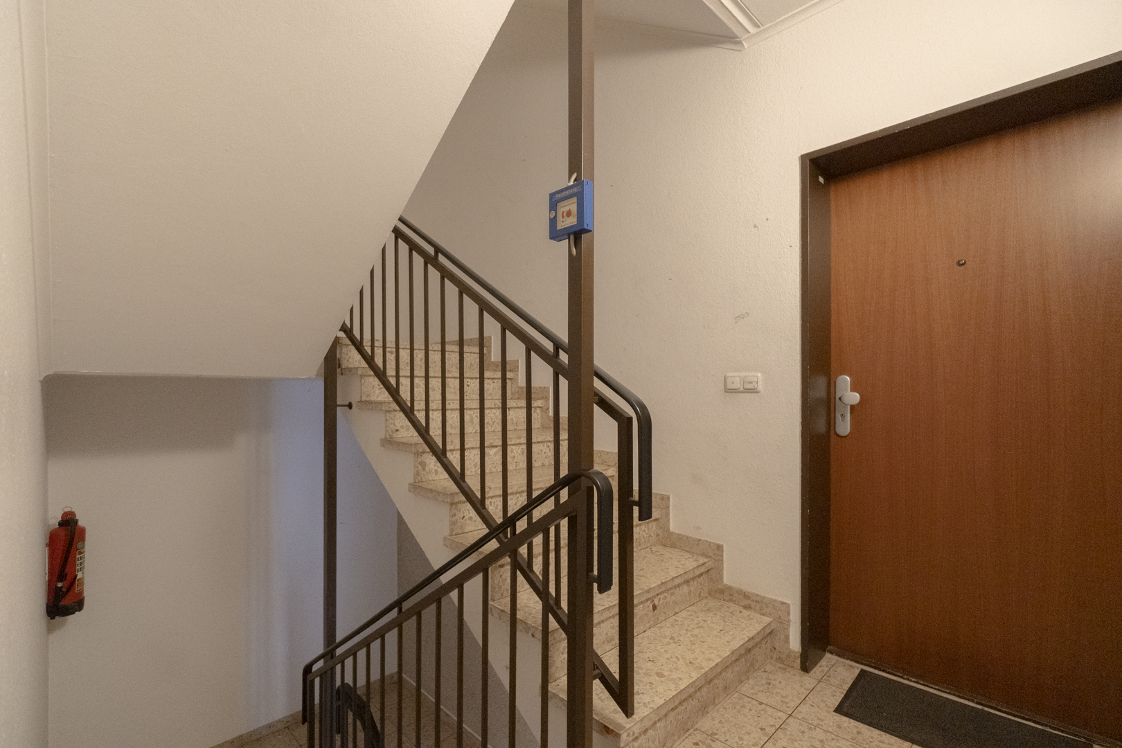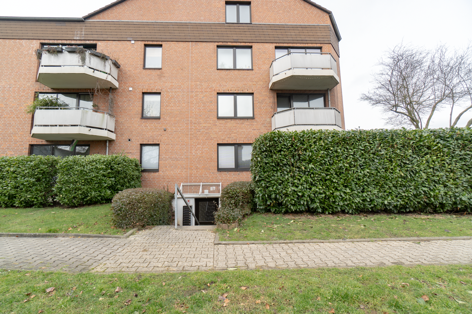 Der Hauseingang befindet sich auf der Souterrainebene. Für den Zugang ist daher zunächst ein Hinabgehen erforderlich; innerhalb des Gebäudes führt der Weg anschließend wieder nach oben zur Wohnung, die sich im Erdgeschoss befindet.