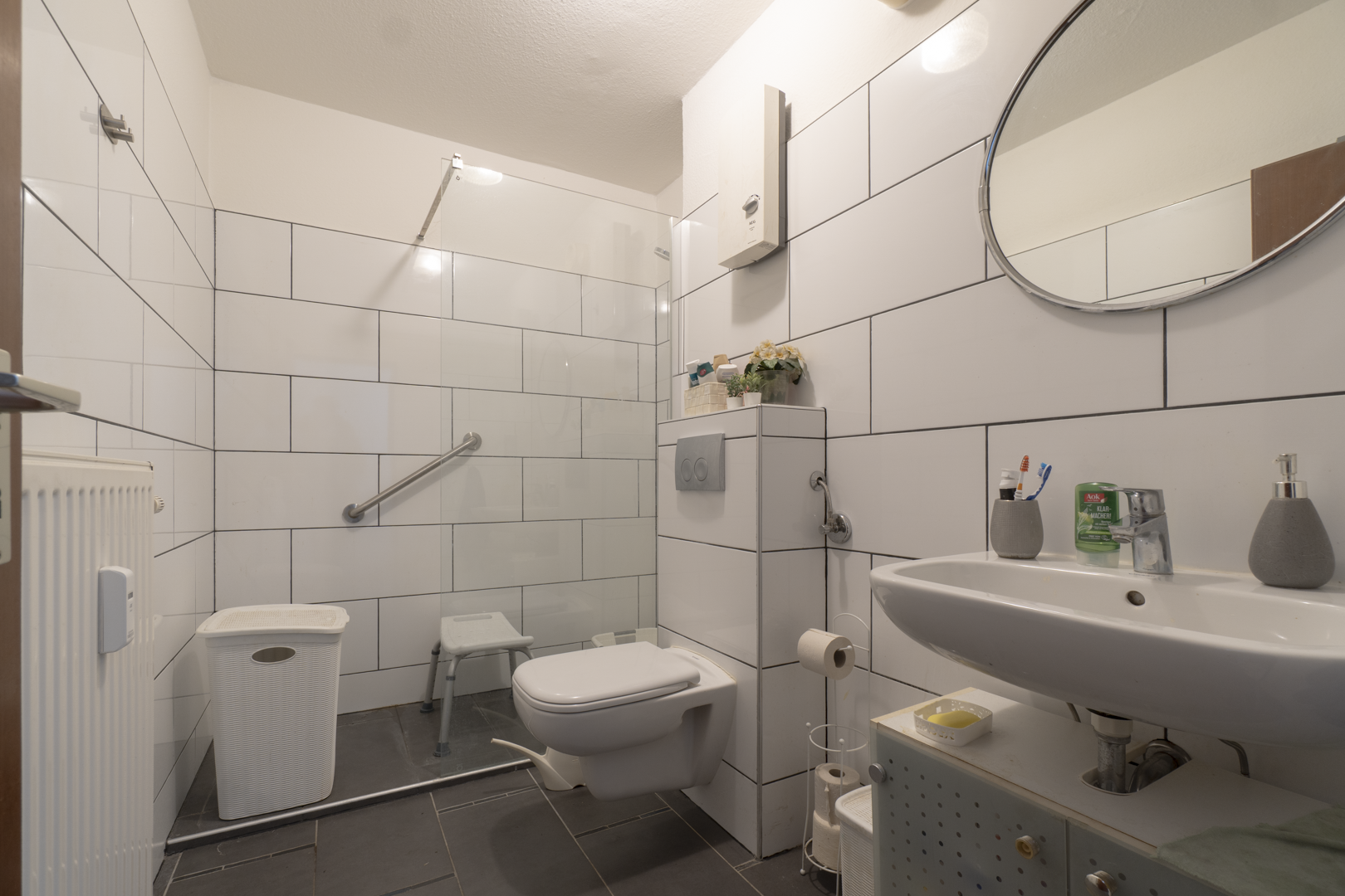 • Großzügiges Badezimmer, nahezu ebenerdig (Schwelle ca. 2–3 cm).