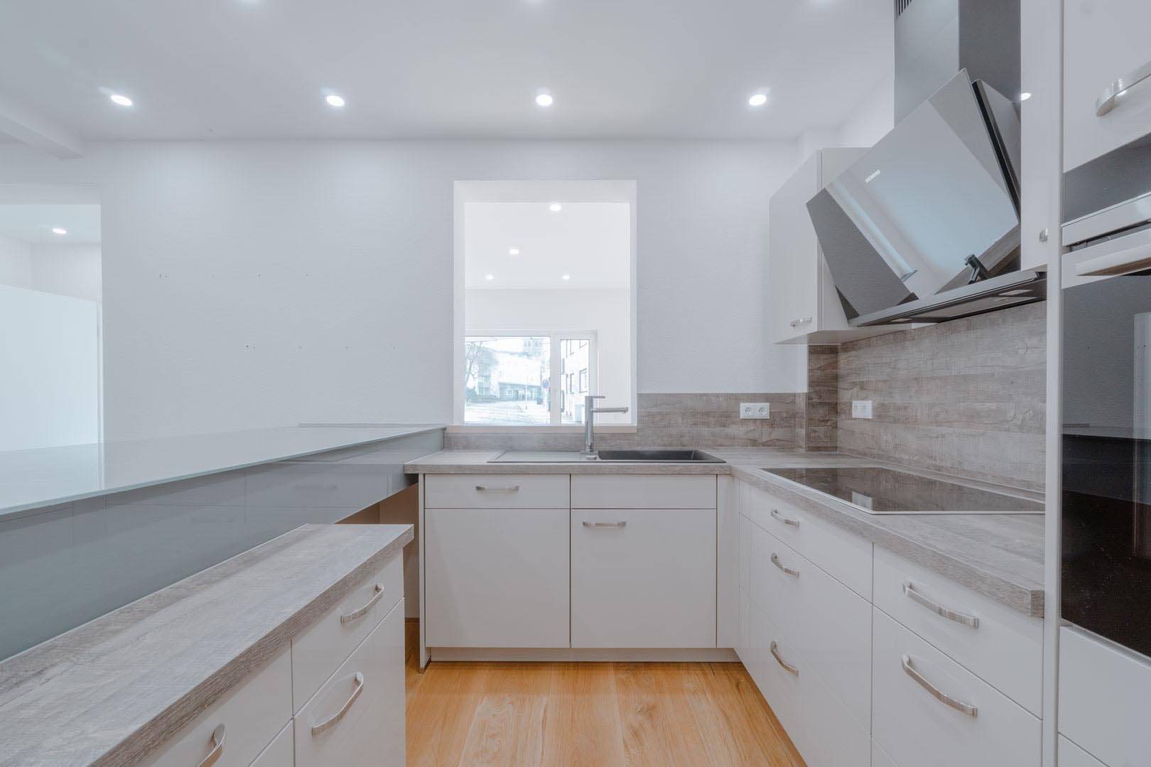Ein großzügiger Empfangsbereich führt in einen offen gestalteten Arbeitsbereich mit angrenzender Küchenlösung. Die maßgefertigte Einbauküche in U-Form mit Siemens-Geräten, bietet einen integrierten Thekenbereich.