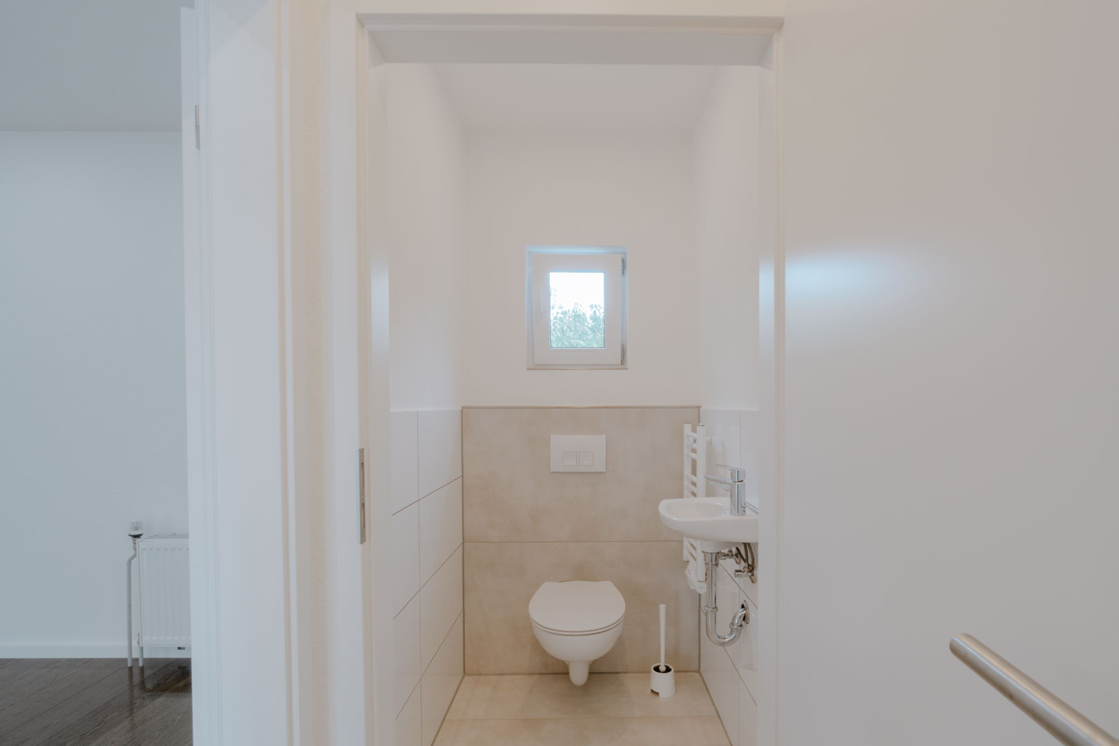 Ein separates Gäste-WC mit zusätzlicher Abstellnische ist ebenfalls vorhanden.